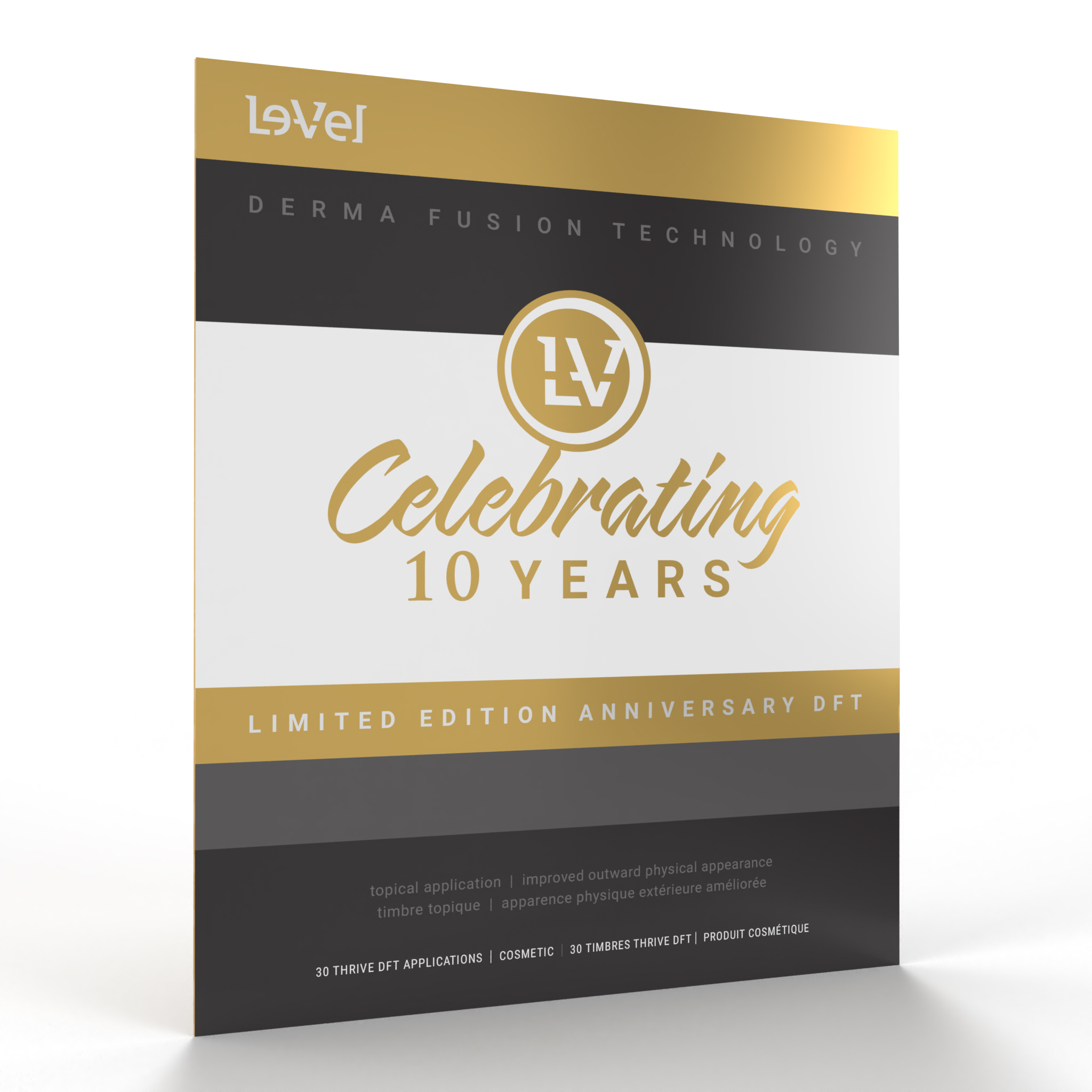 Le-Vel’s 10 Year Anniversary is here and we’re celebrating with a brand new innovation in Derma Fusion Technology. 10 YEAR ANNIVERSARY DFT is our largest surface size ever used in a single DFT application. We took our 10 years of experience and hundreds of millions of DFTs sold, to create a formula that combines the largest amount of ingredients possible, pulling features from our best-selling line of Standard, Ultra and Black Label into this Limited Edition 10 Year Anniversary DFT. Take your THRIVE Experience to the next level by using 10 Year Anniversary DFT as your 3rd Step.